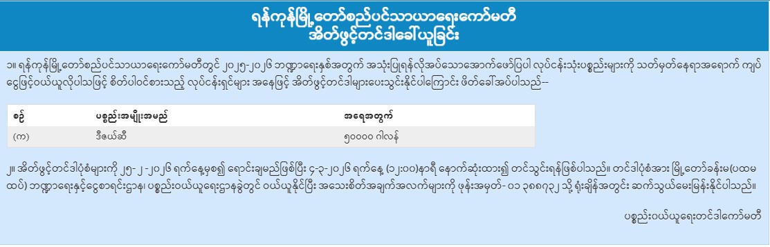 ရန်ကုန်မြို့တော်စည်ပင်သာယာရေးကော်မတီ အိတ်ဖွင့်တင်ဒါခေါ်ယူခြင်း
