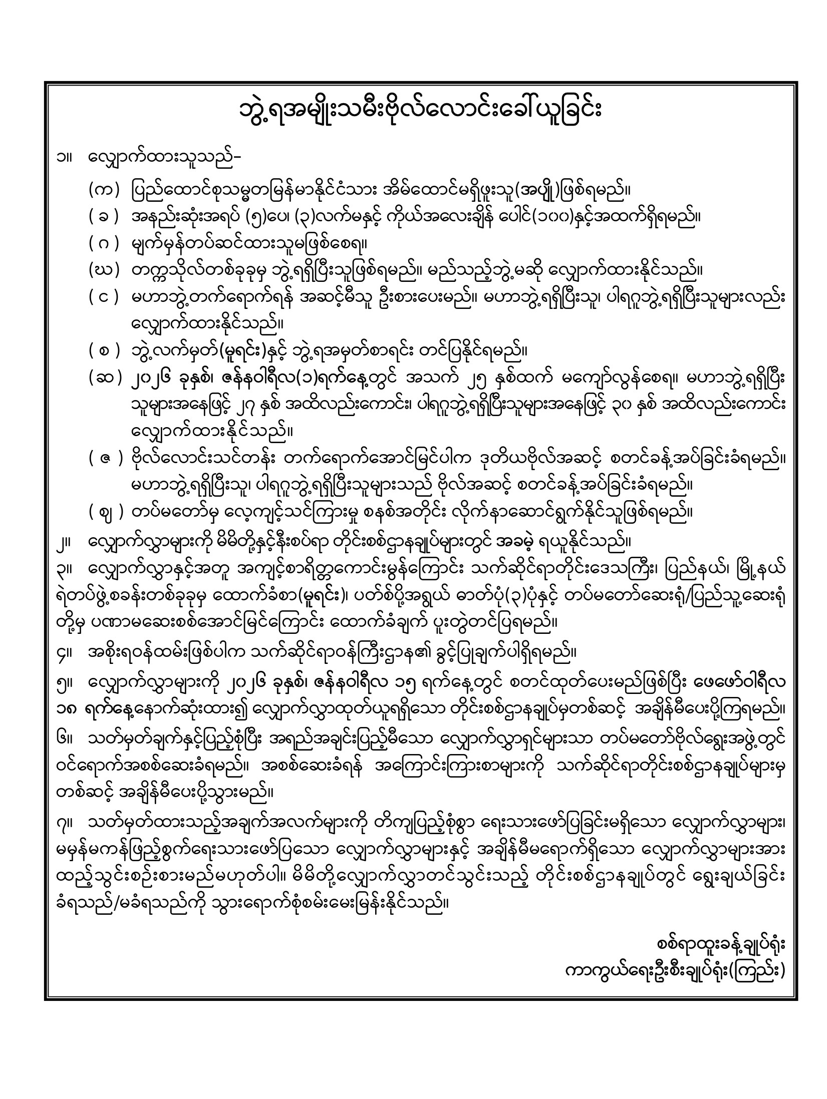 လျှောက်လွှာပိတ်ရက်တိုးမြှင့်သတ်မှတ်ကြောင်းကြေညာခြင်း