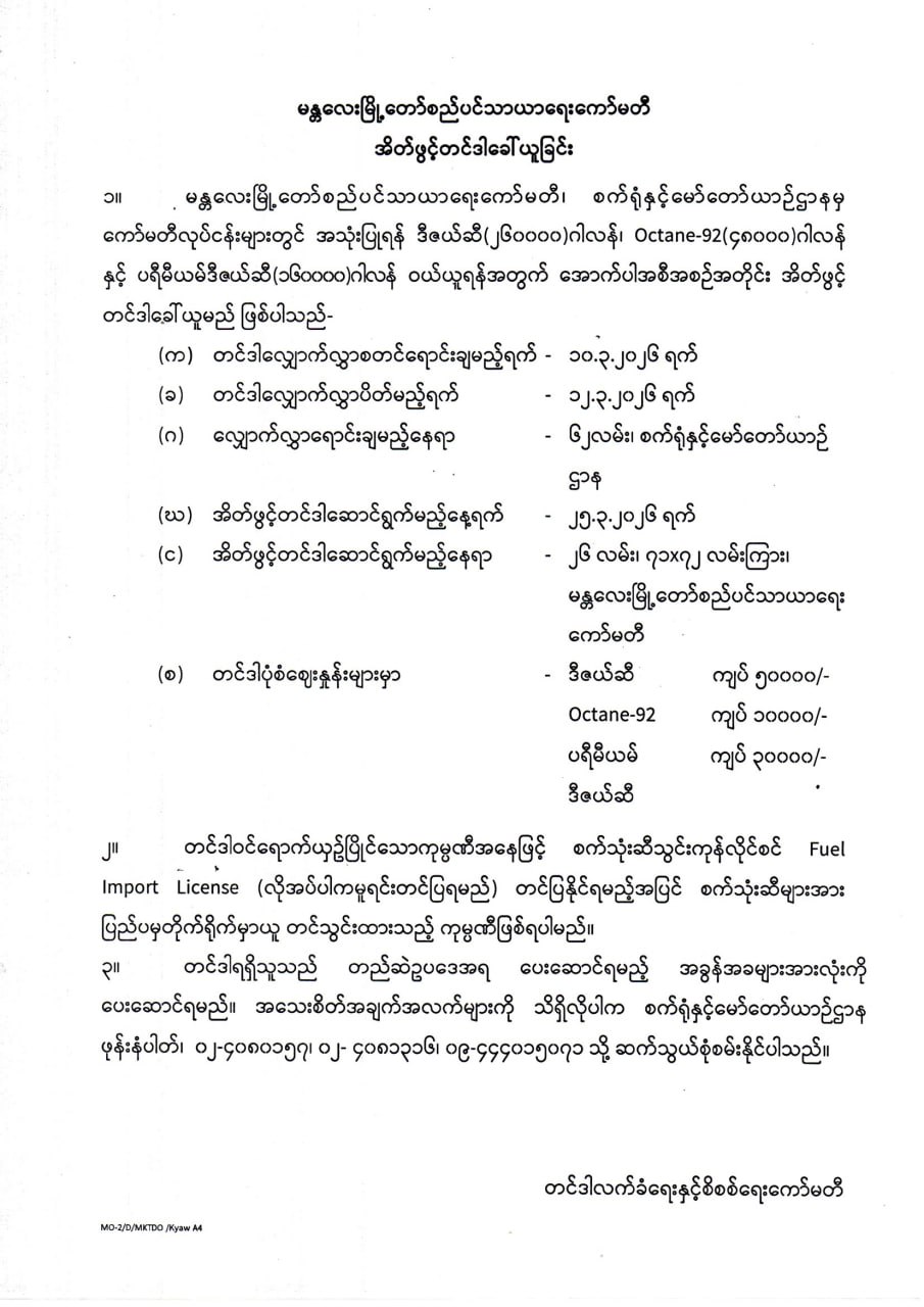 မန္တလေးမြို့တော်စည်ပင်သာယာရေးကော်မတီ၊ စက်ရုံနှင့်မော်တော်ယာဉ်ဌာန၊ အိတ်ဖွင့်တင်ဒါခေါ်ယူခြင်း